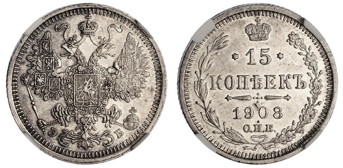 Russia. Nicholas II (1894-1917). 15 Kopeks, 1908 CПБ-ЭБ. Crowned Imperial eagle. Y.21a.2. NGC MS 63.