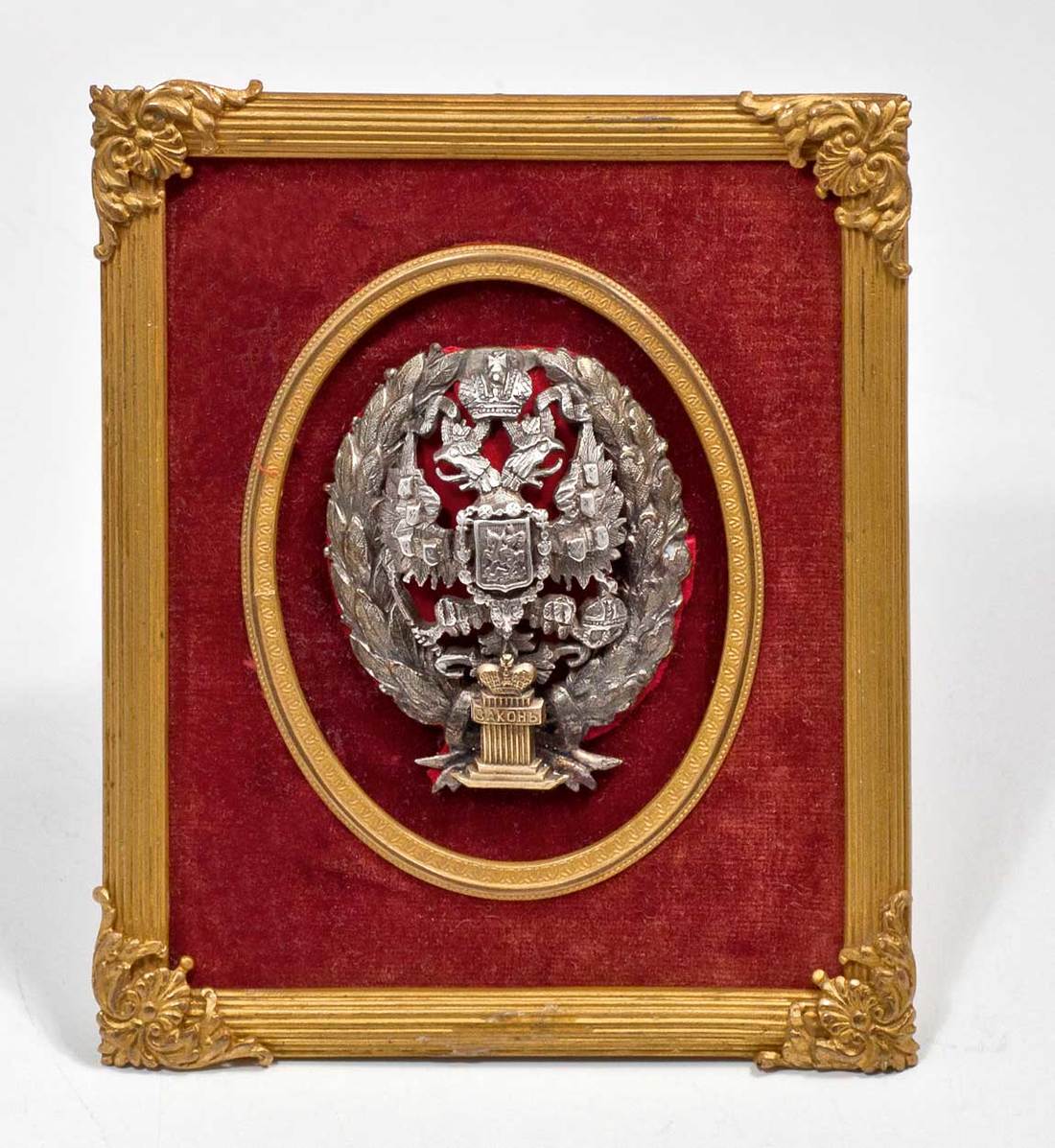 Russia. Imperial Russian Law Academy Badge, ca. early 1900’s. 45 x 54mm. Silver. Imperial eagle within open-work wreath, crown on pedestal, inscribed ЗAKOHЪ at bottom. Displayed in a handsome, classical-styled frame. Extremely Fine.
