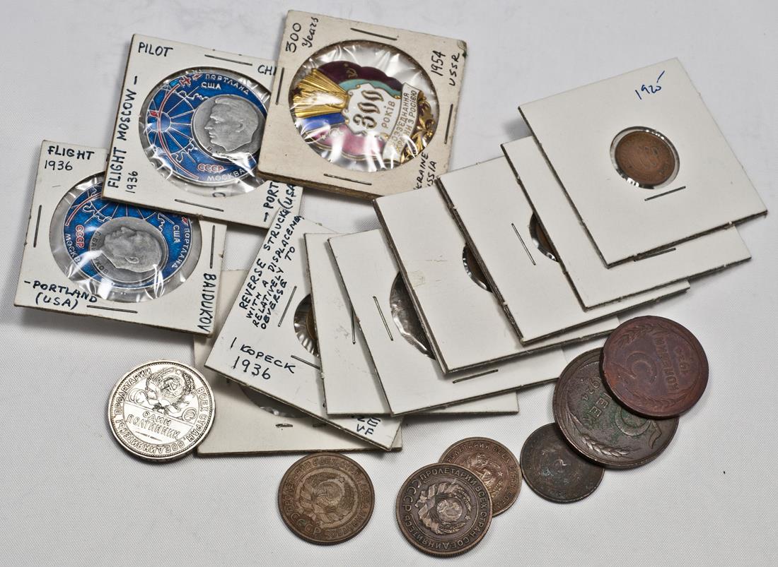 U.S.S.R. Small lot of minors. ½ Kopeks, 1925 (4), 1927 (2), Kopeks, 1924 reeded edge (2), 2 Kopeks, 1924 reeded edge (2), 3 Kopeks, 1924 reeded edge, 5 Kopeks, 1924 plain edge; silver 20 Kopeks (2), 50 Kopeks (polished), AEs (2); also modern enameled badges (3) Generally About VF-EF. (20)
