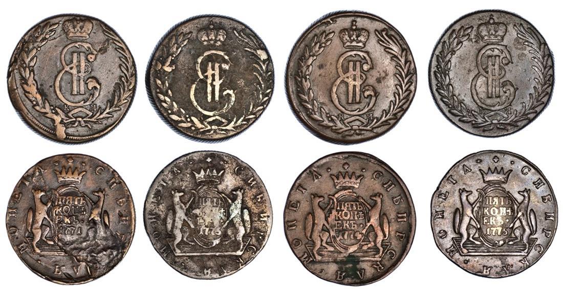 Siberia. Catherine II, "the Great" (1762-1796). Quartet of 5 Kopeks - 1771, 1774, and 1775 (2) KM. Crowned cipher of Catherine within wreath, rev. Crowned oval with value and date supported by two sable. C.5. The first with large obverse flan flaw, one of the 1775 with light dirt and the '74 light deposit. About Very Fine-Very Fine. (4)