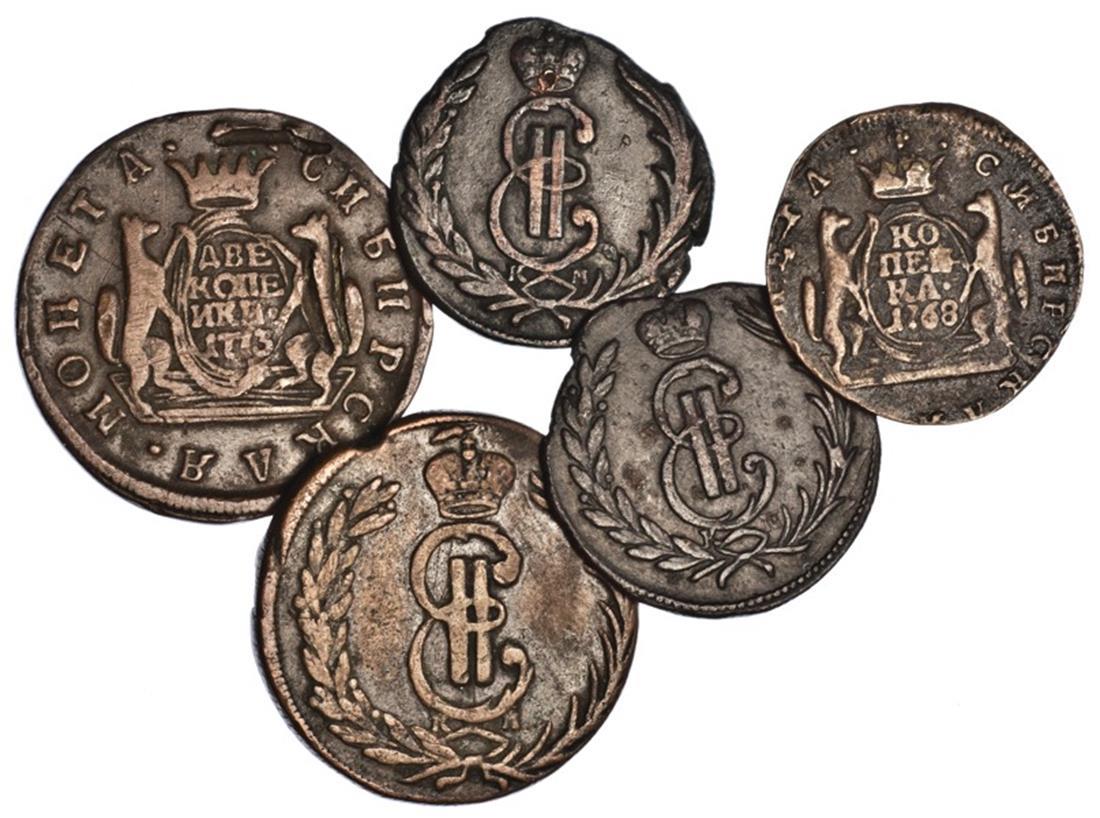 Siberia. Catherine II, "the Great" (1762-1796). Small grouping - 2 Kopeks, 1769, 1773 KM; Kopeks, 1768 (2), 1771 KM . C.4, 3. The 1773 2 Kopeks with obverse die flaw, the 1769 with some obverse pinscratches; one of the 1768 Kopeks with deposits. (5)