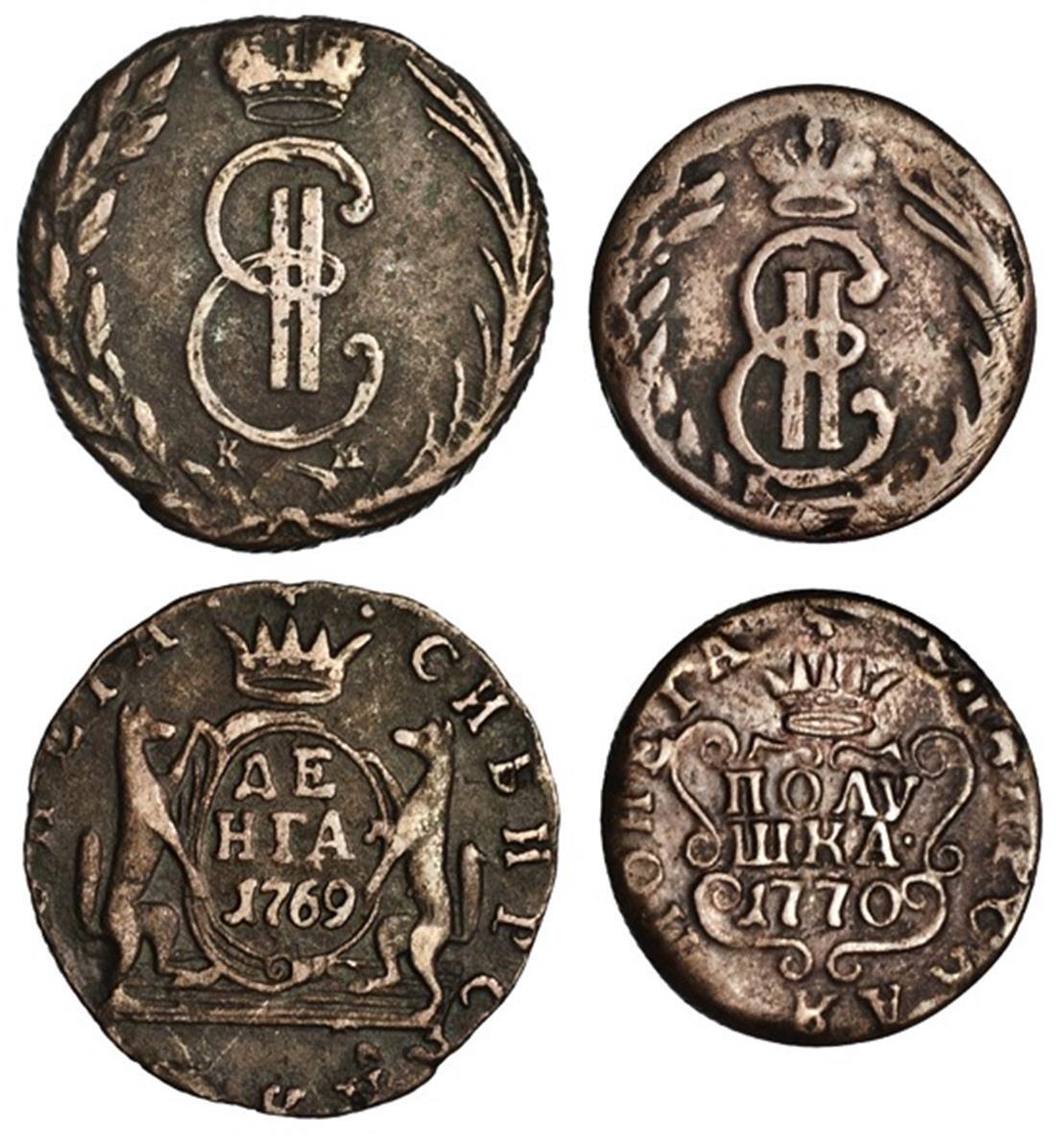 Siberia. Catherine II, "the Great" (1762-1796). Pair: Polushkla, 1770 KM; Denga, 1769 KM. Crowned cipher of Catherine within wreath, revs. Crowned value within cartouche, Crowned oval with value and date supported by sable. C. 1, 2. Very Fine. (2)