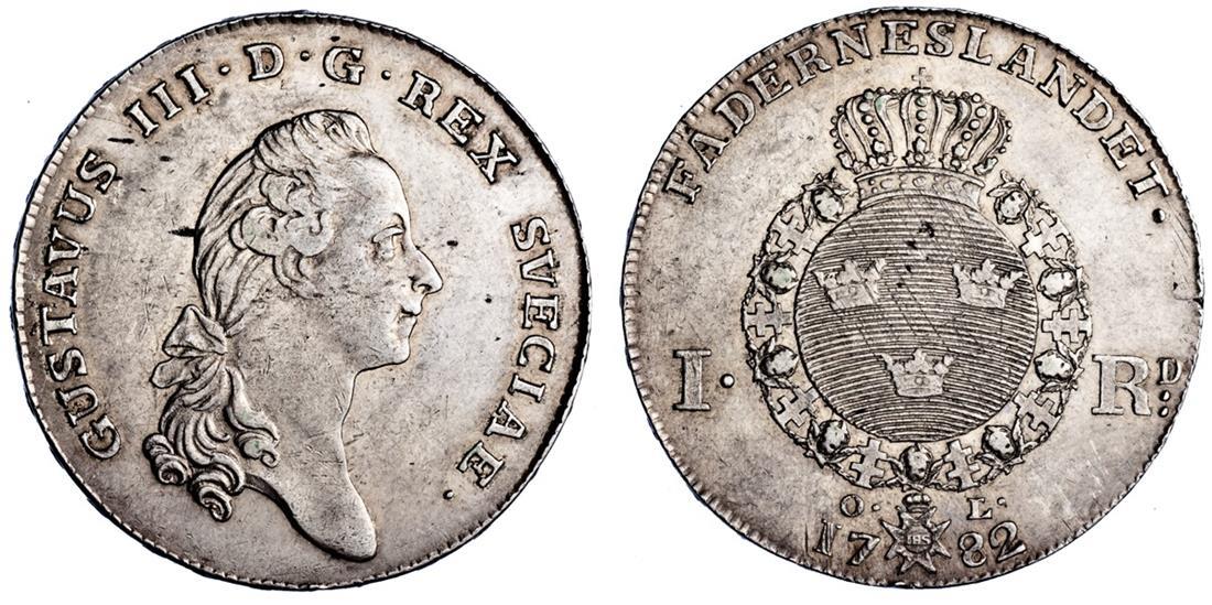 Sweden. Gustav III (1771-1792). Riksdaler, 1782 OL. Peruked head right, rev. Crowned oval Arms within Order chain. Dav.1736, KM 527. Very light adjustment marks reverse center. Decent lustre. About Extremely Fine.