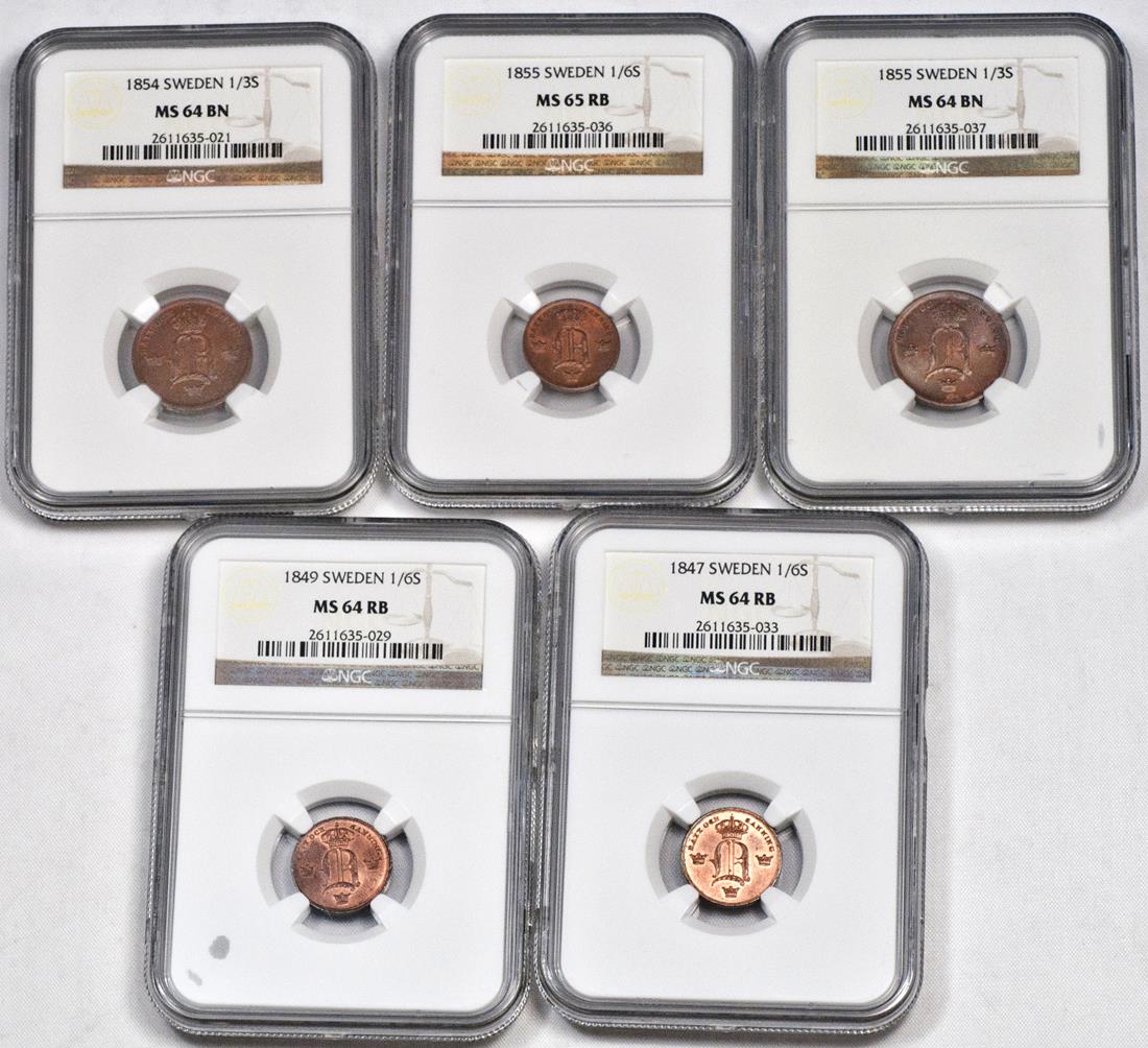 Sweden. Oskar I (1844-1859). Encapsulated quintet. 1/3 Skilling, 1854, 1855. KM 657. Crowned O I monogram. NGC MS 64 BN; and 1/6 Skilling, 1847, 1849, 1855. KM 656. The first two NGC MS 64 RB, the latter NGC MS 65 RB. (5)