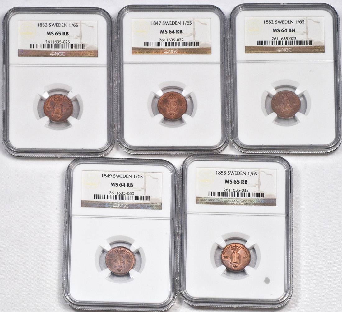 Sweden. Oskar I (1844-1859). Encapsulated quintet. 1/6 Skilling, 1847, 1849, 1852, 1853, 1855. Crowned O I monogram, 3 crowns around. KM 656. The first 2 NGC MS 64 RB, the third NGC MS 64 BN, the last two NGC MS 65 RB. (5)