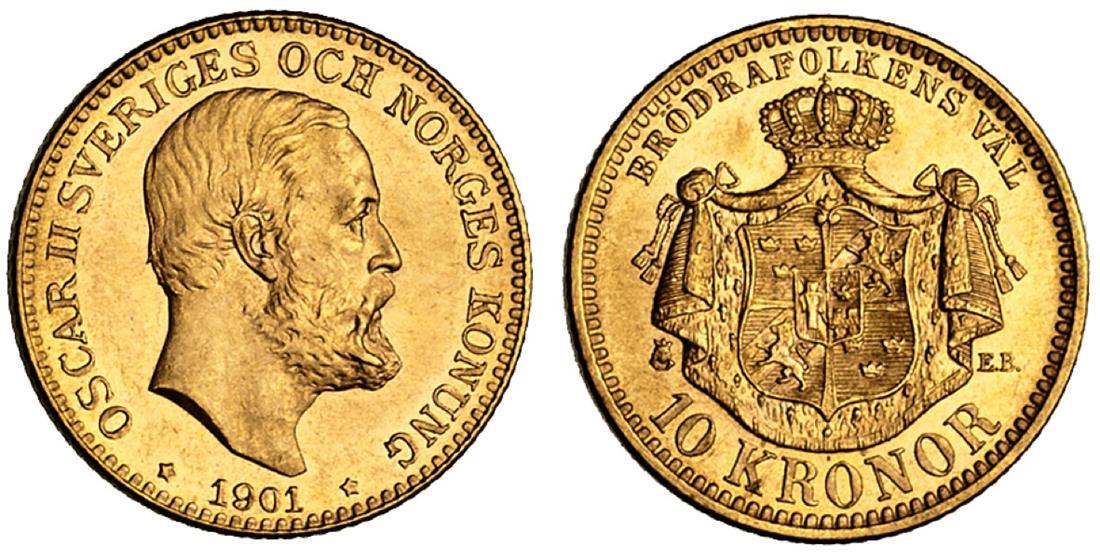 Sweden. Oskar II (1872-1907). 10 Kronor, 1901 EB. Bearded, older head right, rev. Crowned and draped Arms. Fr.95a, KM 767. One-year type. Choice Brilliant Uncirculated.