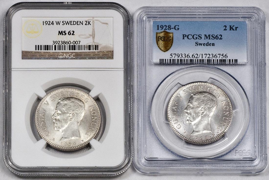 Sweden. Gustaf V (1907-1950). Pair of 2 Kronor, 1924 W and 1928 G. Bare head left, rev. Crowned Arms in Order chain. KM 787. NGC MS 62 and PCGS MS 62. (2)
