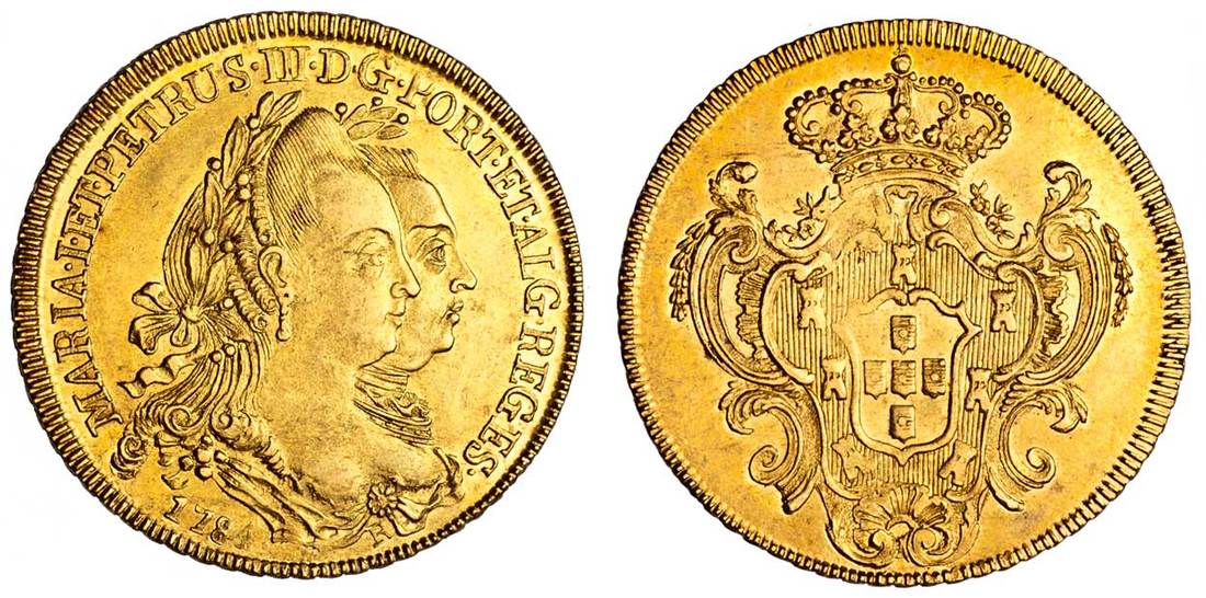 Brazil. Maria I & Pedro II (1777-1786). 6400 Reis, 1781 R. Rio de Janeiro. Laureate, conjoined busts right, rev. Crowned Arms in ornate frame. Fr.76, KM 199.2. Well-struck. Pleasing lustre. Uncirculated