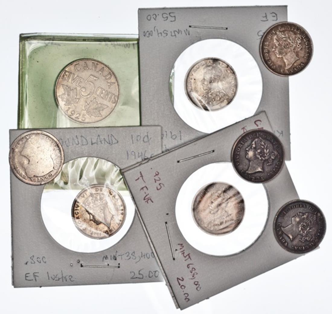 Canada. Victoria-George V. Small lot of minors: Includes key date 5 Cents, 1925. About VF; 10 Cents, 1858, 1888, 1891. Two dark tone, About Very Fine-Very Fine; 10 Cents, 1915. About VF; a well-worn 10 Cents; also Newfoundand. 10 Cents, 1919 C. About EF, and other. (8)