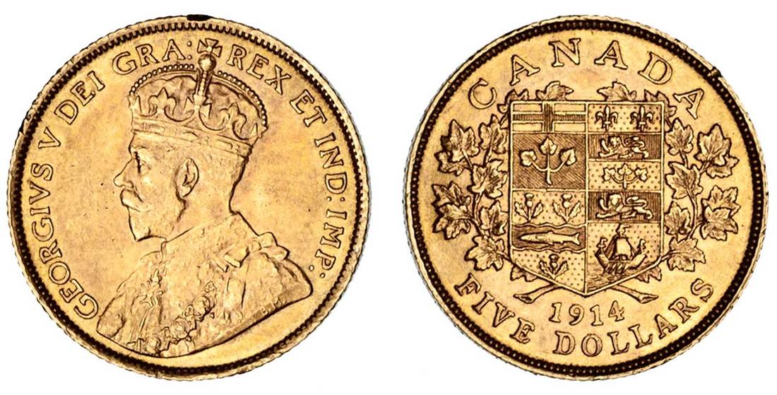 Canada. George V (1910-1936). Five Dollars, 1914. Crowned bust left, rev. Arms in spray. Fr.4, KM 26. Minor rim tics possibly from prongs. Toned Uncirculated.