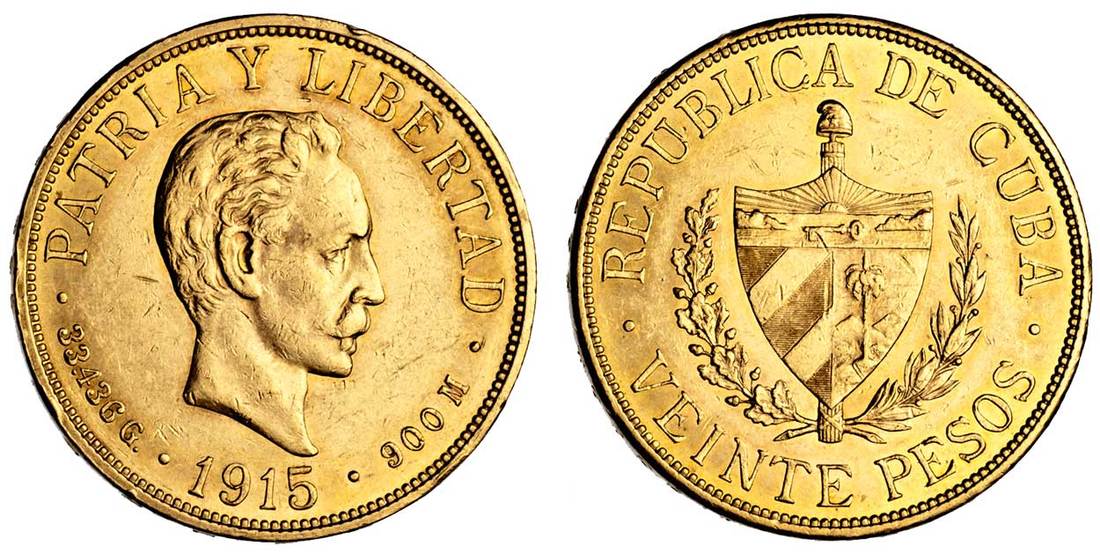 Cuba. Republica.. 20 Pesos, 1915. Head of Jose Martí right, rev. Arms in spray. Fr.1, KM 21. Light stacking marks, a few minor edge tics. Extremely Fine.