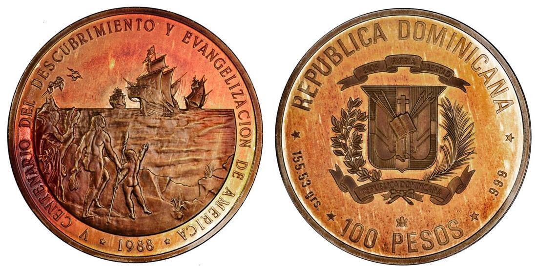 Dominican Republic. 100 Pesos, 1988. Discovery of America - Native Americans. KM 67. 5,300 pieces struck. In original green plush case. Toned deep apricot gold. Brilliant Proof.