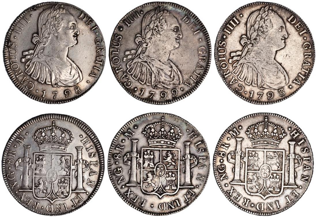 Guatemala. Carlos IV (1788-1808). Trio of 8 Reales: 1793, 1798, 1799 M NG. Nueva Guatemala. Laureate, draped and cuirassed bust right, rev. Crowned Arms flanked by Pillars. KM 53. Lightly toned. Very Fine. (3)