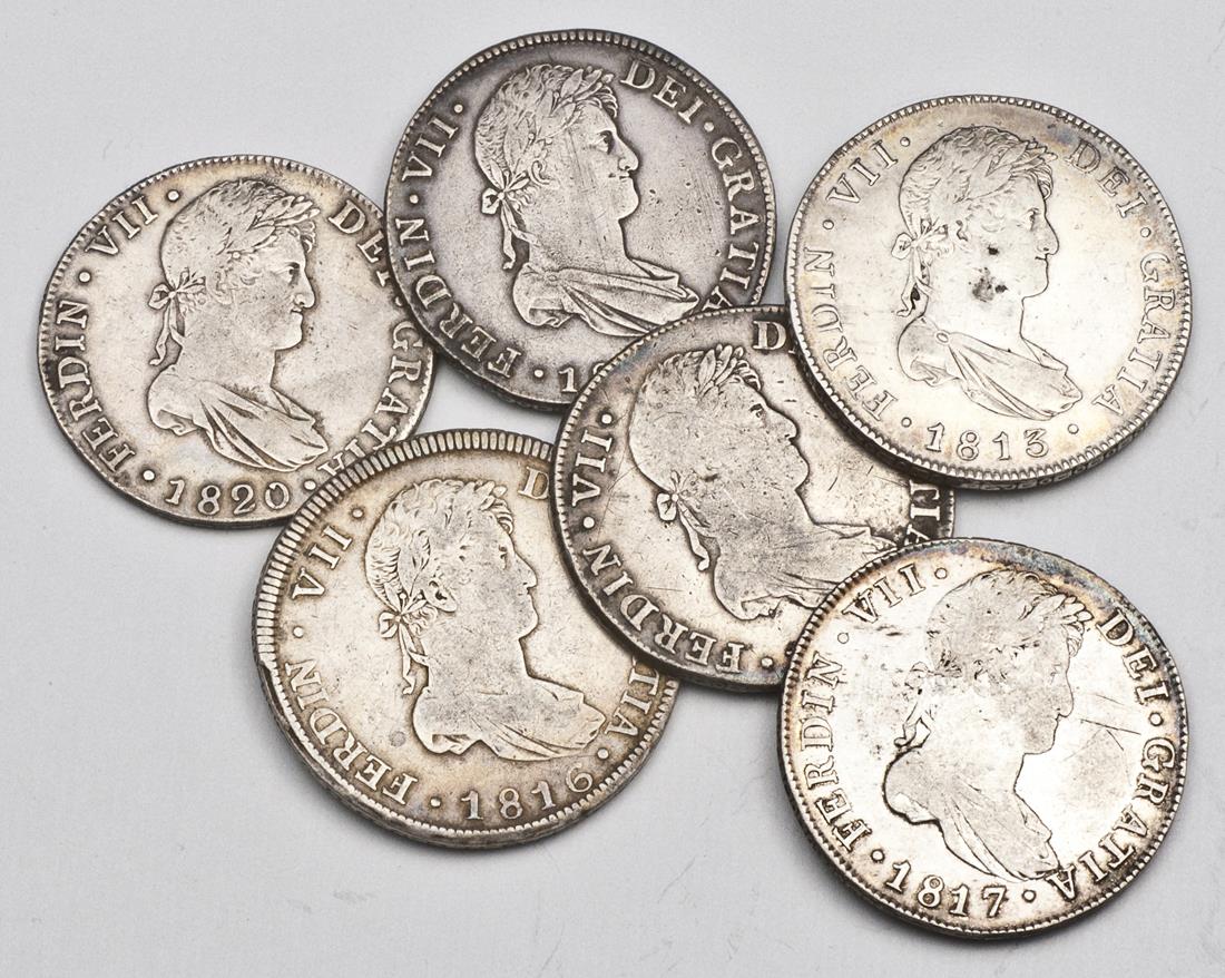 Guatemala. Fernando VII (1808-1821). Sextet of 8 Reales: 1813, 1816, 1817, 1818, 1820, 1821 M NG. Nueva Guatemala. Laureate, draped bust right, rev. Crowned Arms flanked by Pillars. KM 69. The 1817 with graffiti, one with minor deposits. Fine-Very Fine. (6)