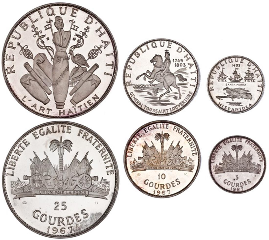 Haiti. Three-piece Silver Prof Set, 1967. Tenth Anniversary of the Revolution. Includes 25 Gourdes - Objets d'art, 10 Gourdes - Toussaint L'Overture, and 5 Gourdes - Columbus discovering America. KM PS2. With original case (inside tray cracked). Brilliant Proof. (3-piece Set)