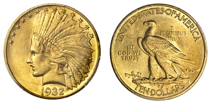 1932 Indian $10. PCGS MS65. A pleasing golden yellow example, sharply struck and with superior luster.