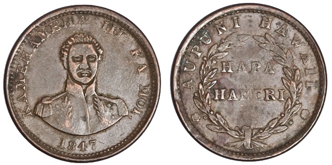 Hawaii. Kamehameha III (1825-1854). Cent, 1847. Plain 4, 15 berries. Facing, uniformed bust of the king, rev. Value HAPA HANERI within wreath. KM 1b. Trivial deposits reverse periphery. About Very Fine.