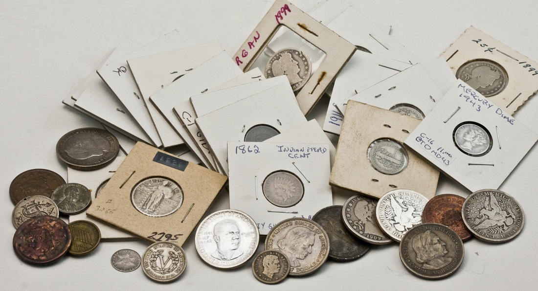Numismatic Assortment. Indian Cents: 1860 VF, dark; 1862 CN Fine; 1864 Bronze pointed bust VG; 1866 VG details, cleaned; 1868 G-VG; 1872 Good details, corrosion; plus six others. Ten Mercury dimes including 1921 G-VG; Three cull Braided Hair LArge Cents; Civil War Token VF; 1857 Silver Three Cent Good; 1883 No Cents Nickel VF; Three 1899 Barber Quarters Good or so; 1929 Standing Liberty Quarter VG; 1903-O, 1906-D, 1909 Barber Halves G-VG; Four Columbian Expo Halves VF to EF; 1946 BTW Half Uncirculated; Hawaian Dime VG; 1875 Twenty Cent Piece Love Token. [42]