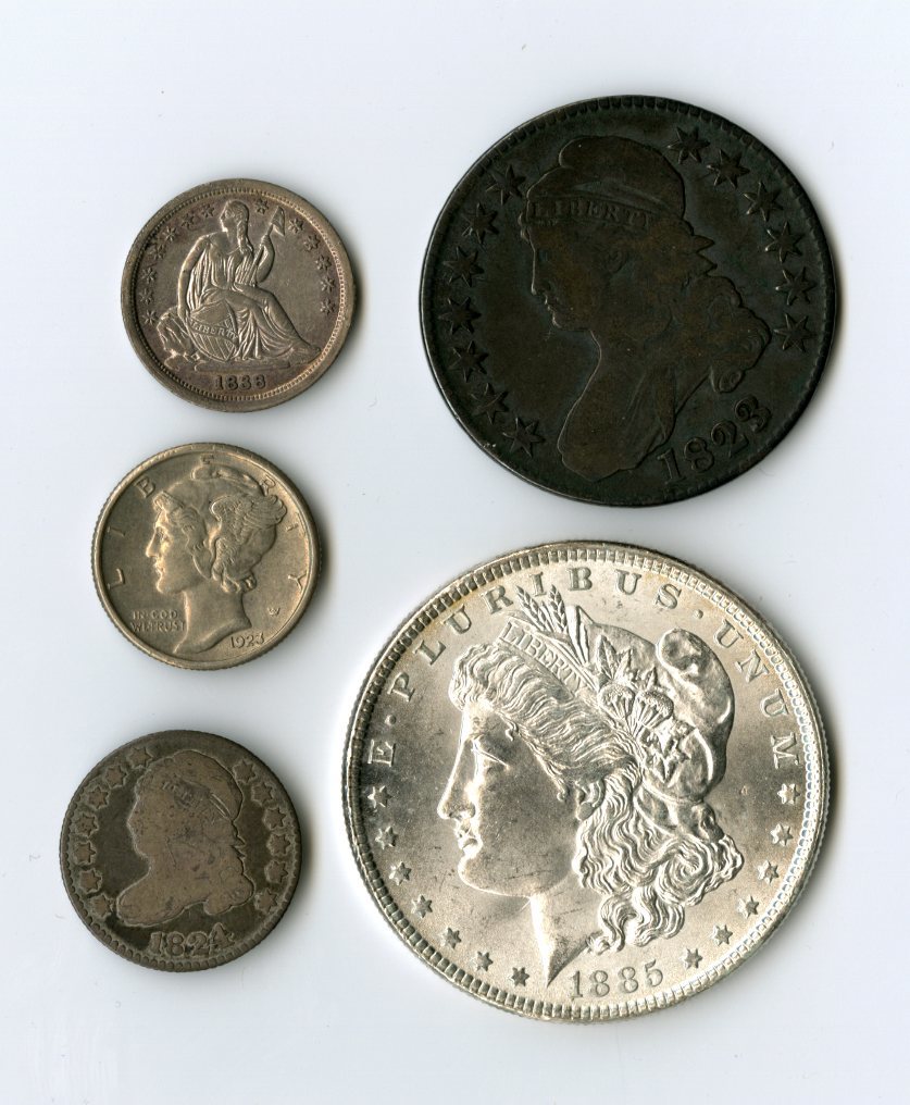 A Nice Assortment of U.S. Type Coins.1824 Bust Dime VG; 1838 Seated Dime Large Stars No Drapery EF. The reverse bisected by a spectacular die crack that extends vertically from top to bottom; 1923-S Mercury Dime EF-AU; 1823 Bust Half Dollar. VF; 1885 Morgan Dollar Choice BU. [5]