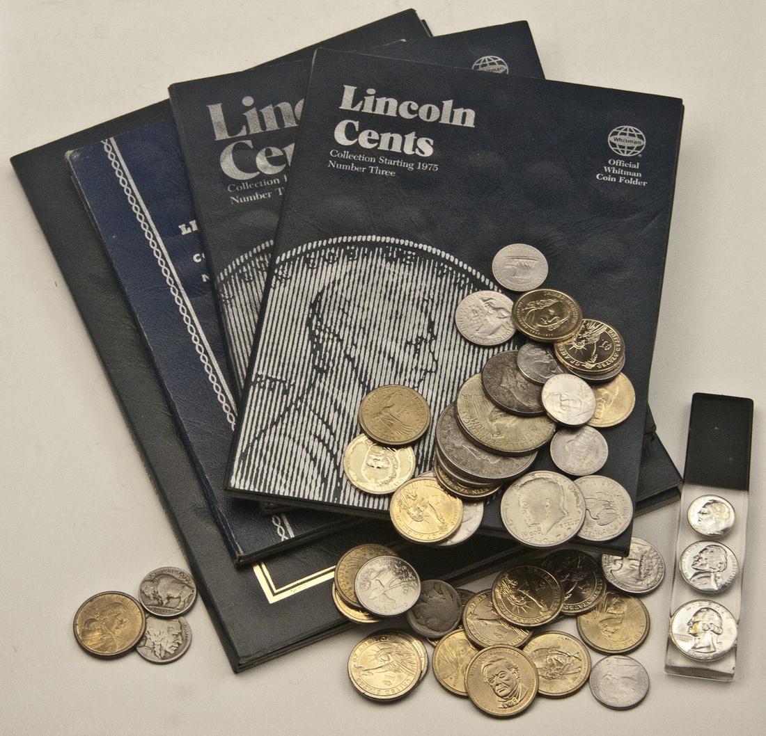 U.S. Coin Assortment. 1921 Morgan Dollar, AU; 1922 Peace Dollar, AU; 1944 Walking Liberty Half Dollar VF; 1964 Kennedy Half, AU; Fifty state commemorative quarter set 1999-2008 in an Official Whitman Coin Fold, Brilliant Uncirculated (100 pcs.); Three partial sets of mostly circulated Lincolns, 1941-1974, 1975 on, 1941 -1960's; About $20 face value in Presidential dollars and other U.S. coinage.