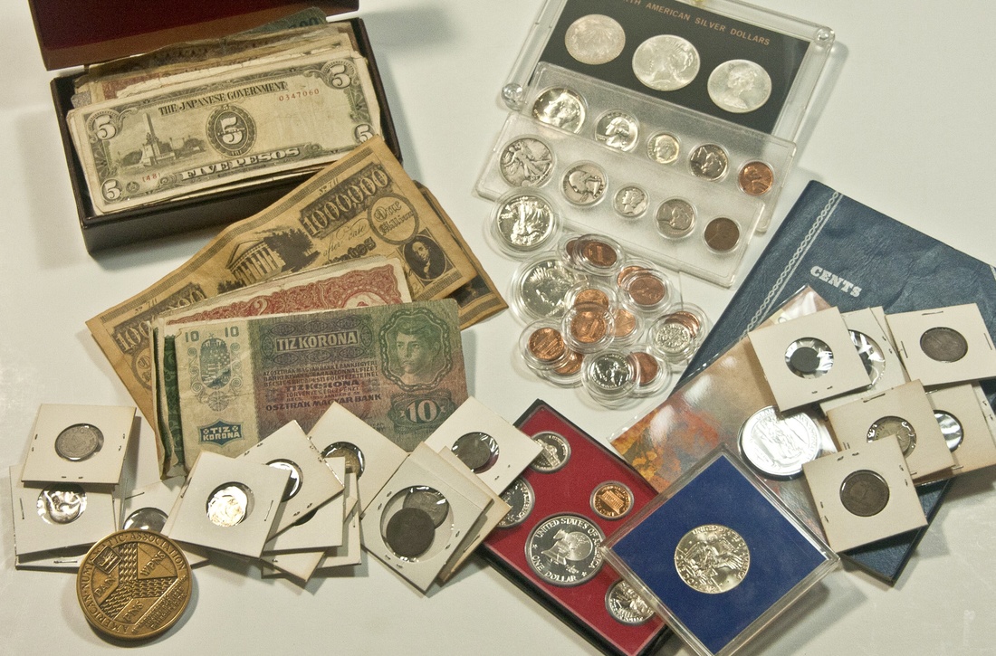 Large Lot of U.S. and World Coins. United States: 1945 Walking Liberty Half Dollar Gem BU; 1945 Mercury Dimes (2 pcs.) Choice BU; 1950-D Nickel BU; 1976-S 6-Piece Proof Set; 1976 3-Piece Silver Proof Set; "North American Silver Dollars" 3-pc. Set; assorted Ike & Susan B. Anthony Dollars (15 pcs.); assorted clad Kennedy Halves (17 pcs.); at least $5 in 90% silver coins; a few assorted medals and other numismatic properties. World Coins and Paper: a box of approximately 150 World coins, many in cardboard 2 x2s - a quick glance reveals a Mexican gold 2 Peso, Israel 1949 500 Pruta BU; 1879 Austrian 1 Franc; 1910 Lichtenstein 5 Kronen VF. Also included is a small box full of mostly Austrian, German and Japanese World War II paper money. Sold as is, no returns. Must be seen.