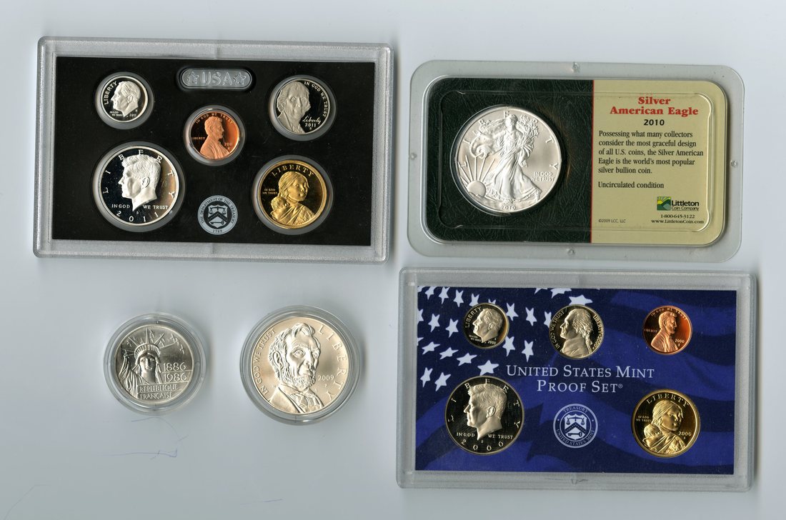 Proof Sets, State Quarters and More. 2000-S 5-piece Proof Set, Cent through $1; 2011-S Cent through $1; 2010 Silver Eagle; Washington Commemorative Half Dollars 1982 Uncirculated (3 pcs.) and Proof (3 pcs.); 2009 Lincoln $1 Uncirculated; 1999 and 2000 Unc. Sacagawea Littleton sets (4 pcs.); 1986 French 100 Francs, and more.