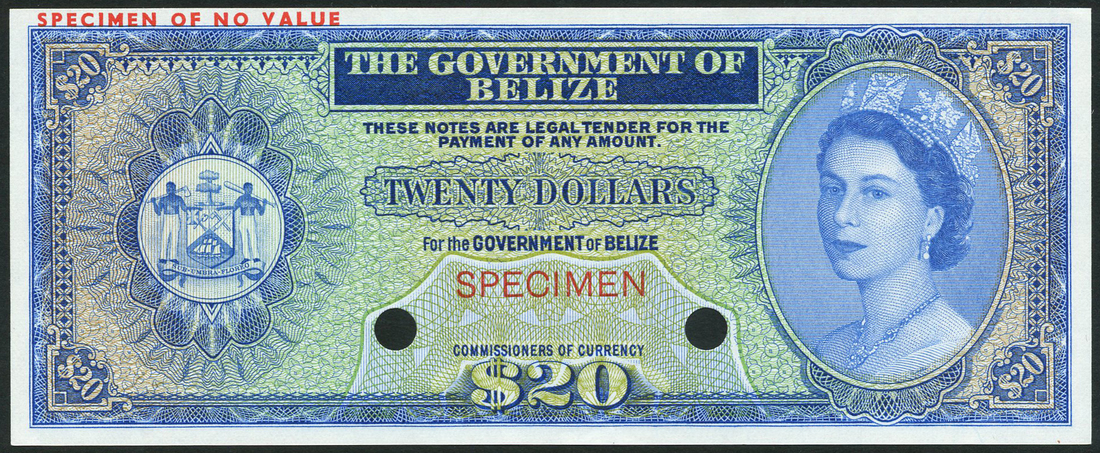 Government of Belize, colour trial $1, blue, colour trial $2, brown, colour trial $5, red, colour trial $10, green and colour trial $20, blue, all ND (1974), all Elizabeth II at right, arms at left