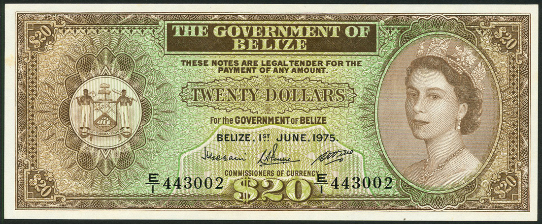 Government of Belize, $20, 1 June 1975, serial number E/1 443002, brown and green, Elizabeth II at right, arms at left, signatures of Cain, Fonseca and Cattouse, reverse lilac, green and brown