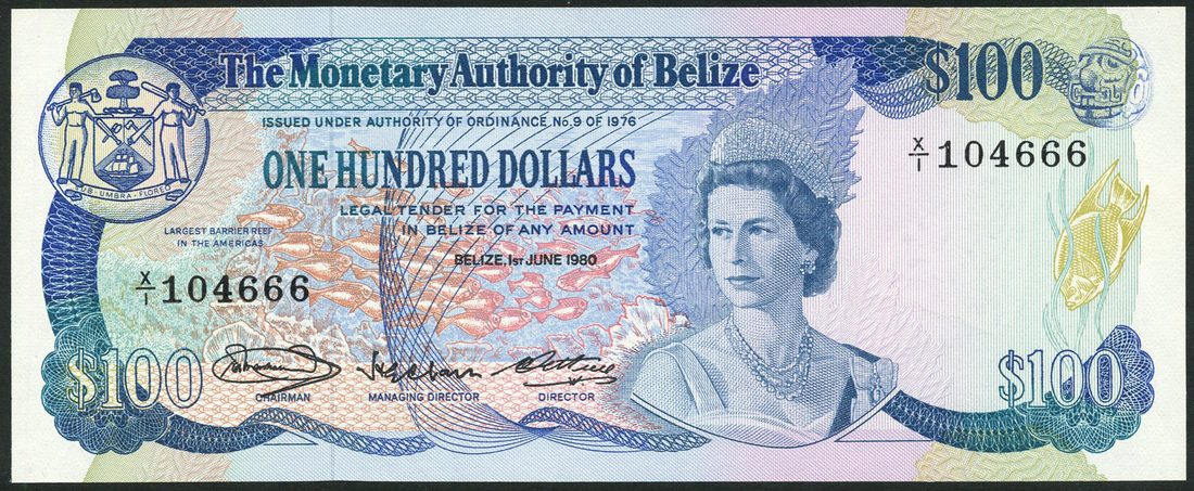 Monetary Authority of Belize, $100, 1 June 1980, serial number X/1 104666, blue and multicoloured, Elizabeth II at right, arms top left, signatures of Marshalleck, Cain and Cattouse, reverse blue, the National Assembly Building in Belmopan