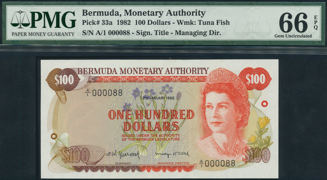 Bermuda Monetary Authority, $100, 2 January 1982, serial number A/1 000088, orange and brown on multicolour underprint, Elizabeth II at right, value at corners, reverse, arms at top left, House of Assembly at left, Camden at top right
