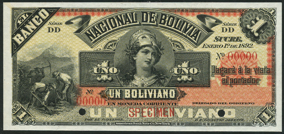 Banco Nacional de Bolivia, specimen 1 sucre, 1892, zero serial number, black on yellow and orange underprint, helmeted female at centre, group of miners at low left, bank title top centre, value in each corner and at centre, reverse, ornate orange panel with shepherdess at centre
