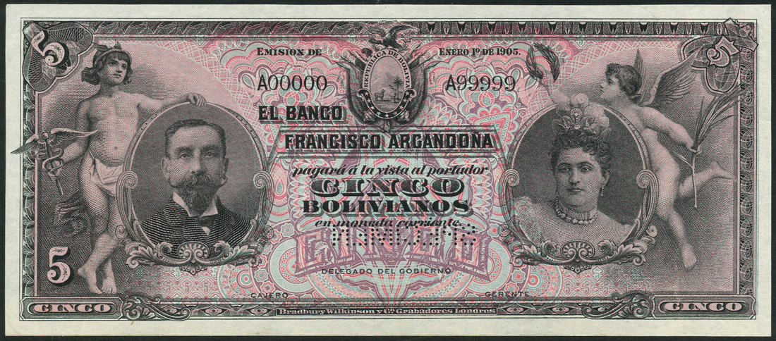 Banco Francisco Argandona, Bolivia, printers archival specimen 5 bolivianos, 1 January 1905, serial numbers A00000-A99999, black on pale green and blue and pink, Francisco Argandona at left with a childlike representation of Mercury, Mrs Argandona at right with cherub with wreath and palm frond, arms at top centre, reverse blue, Castillo de la Glorieta flanked by values, perforated SPECIMEN