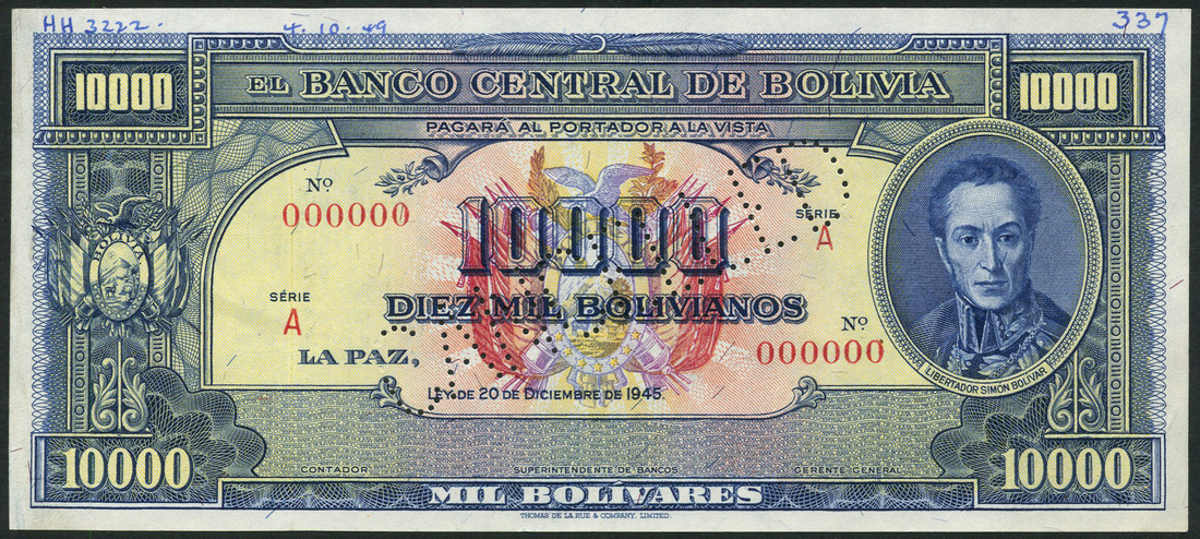 El Banco Central de Bolivia, specimen 5,10,20,50,100,500,1000 and 5000 and 10000 bolivares, all 1945, all zero serial numbers, various colours and either Bolivar or de Sucre portraits
