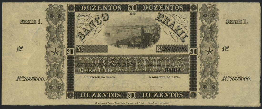 Banco do Brazil, specimen 200 mil reis, Bahia, Serie 1, ND (ca 1856), black on brown paper, view of Bahia top centre, ornate vertical panel with star at centre at left and right, counterfoil at left and right