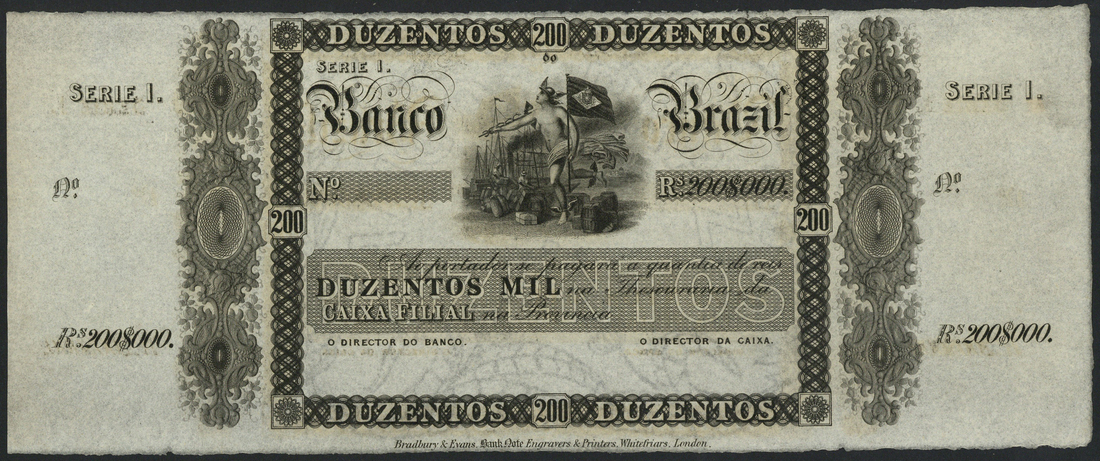 Banco do Brazil, specimen 200 mil reis, Serie 1, Maranhao?, ND (ca 1856), black and white, Mercury with Brazilian flag, dockside scene in background, ornate vertical panel at left and right, counterfoil at left and right