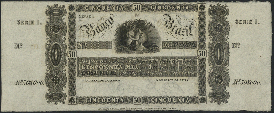 Banco do Brazil, specimen 50 mil reis, Serie 1, Para ?, ND (ca 1856), black and white, Indian maiden seated at centre with globe and flowers, ornate vertical panel at left and right, counterfoil at left and right