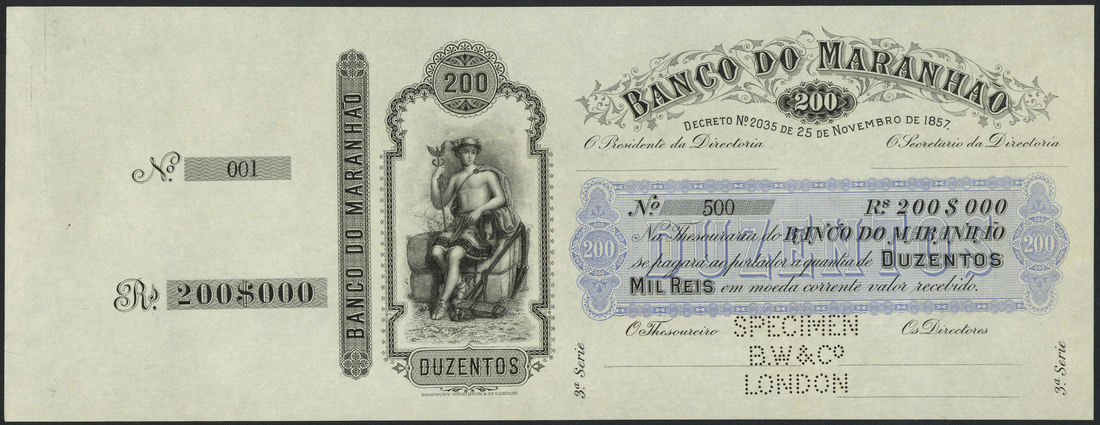 Banco do Maranhao, Brazil, specimen 200 mil reis, 25 November 1857 (1885), serial number 001-500, black and white, value in blue panel at centre, Mercury holding caduceus seated at right on bale and anchor, counterfoil at left