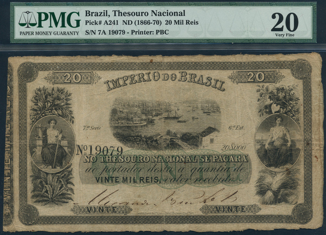 National Treasury, Imperio do Brasil, 20 mil reis, ND (1866-70), serial number 7A 19079, black on green underprint, Rio de Janerio harbour at centre, allegorical maidens in ornate panels at left and right, manuscript signature at low centre