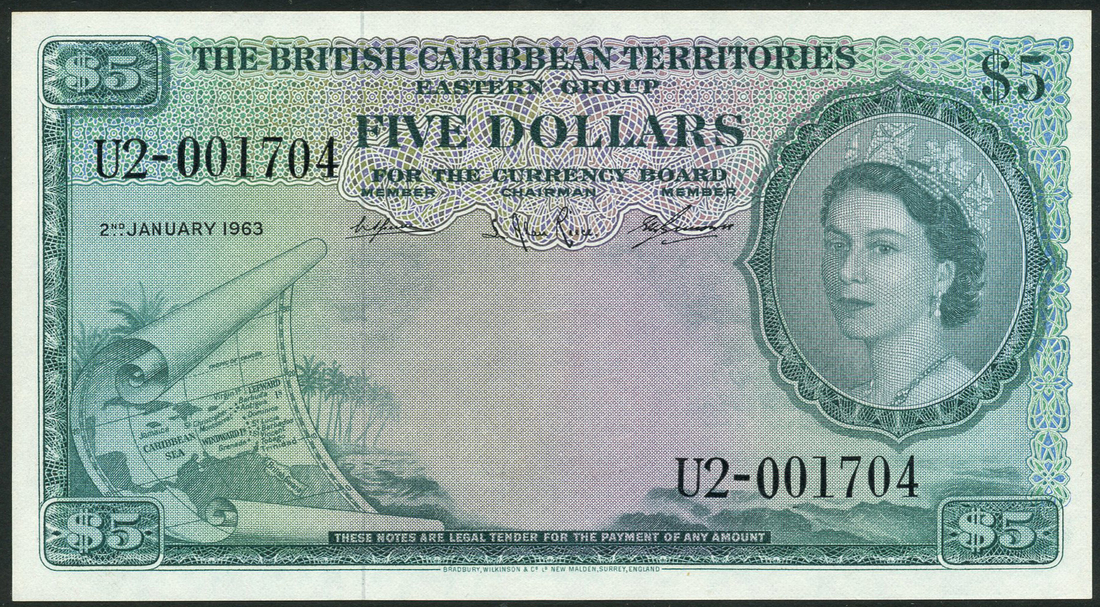 British Caribbean Territories, $5, 2 January 1963, serial number U2-001704, green and mauve, Elizabeth II at right, map low left, signatures of McDavid, Robertson and Cuke, reverse green, arms and King in biga of hippocamps