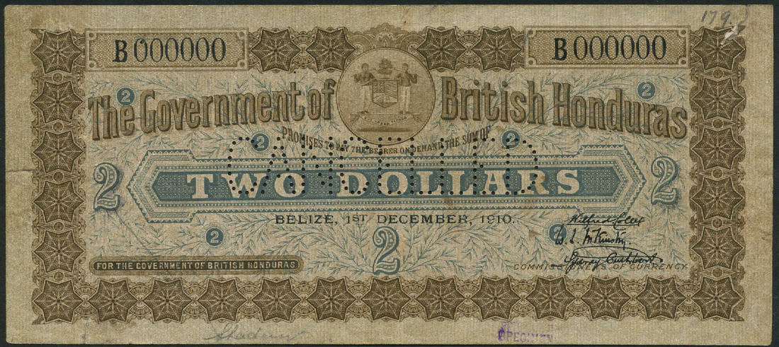 Government of British Honduras, specimen $2, Belize, 1 December 1910, serial number B 000000, brown, value in blue tablet at centre, three printed signatures low right, reverse brown