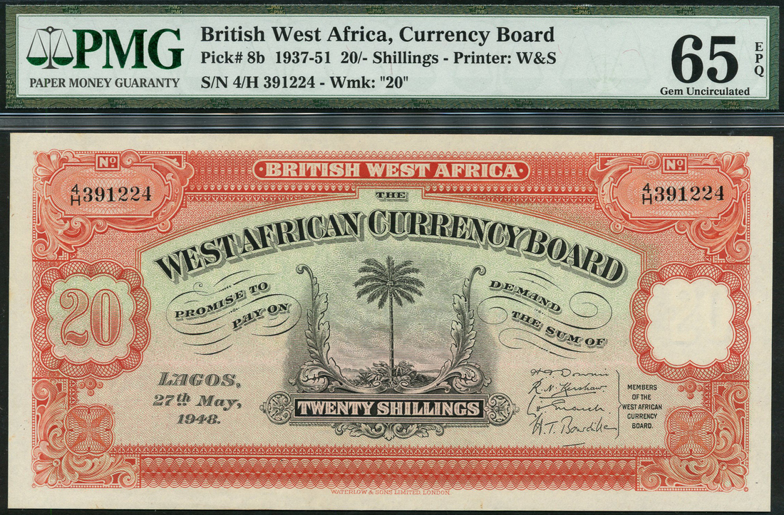 West African Currency Board, 20 shillings, 27 May 1948, serial number 4/H 391224, red and black on green underprint, palm tree at centre