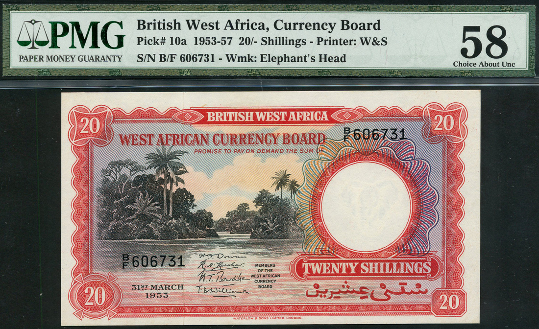 West African Currency Board, 10 shillings, 1957 and 20 shillings, 1953, prefixes A/R and B/F, green and red respectively, river and trees at left, reverse, groundnut and cacao harvests