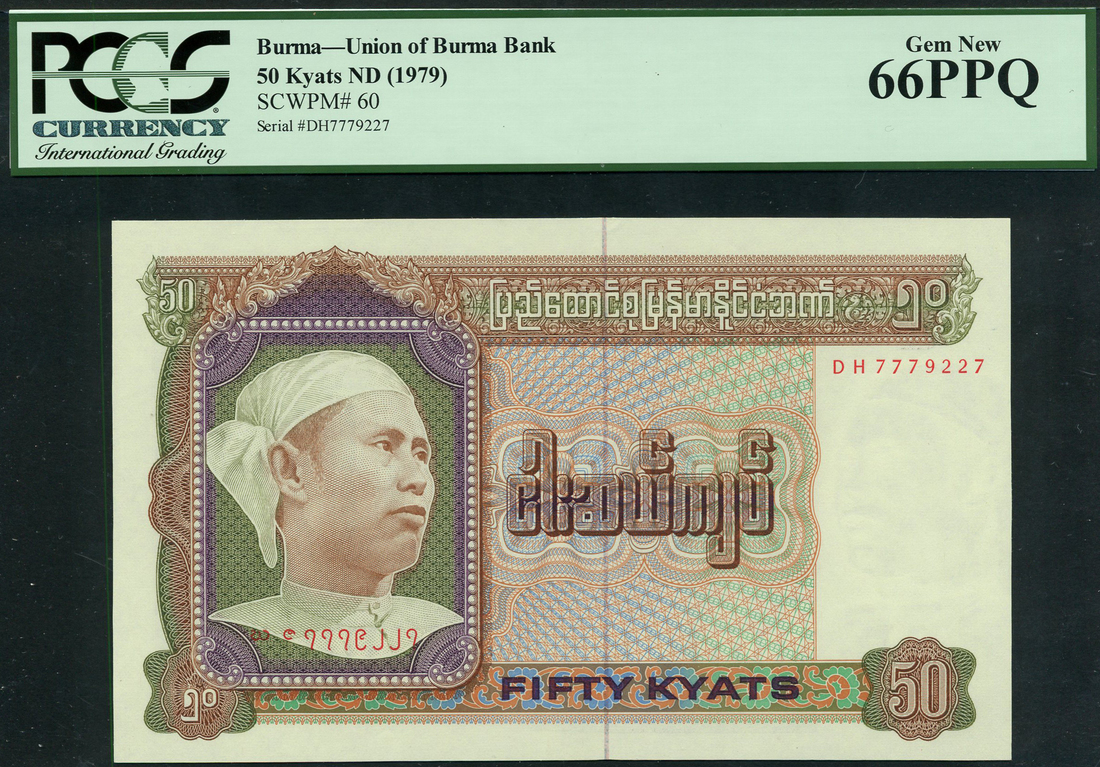 Union of Burma Bank, 50 kyats, ND (1979), red serial number DH 7779227, violet and multicoloured, General Aung San at left, reverse brown and multicoloured, galon at left