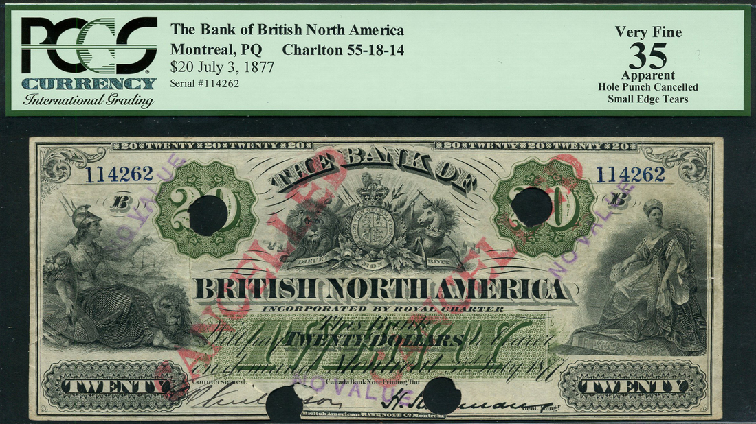 Bank of British North America, Canada, $20, Montreal, 3 July 1877, blue serial number 114262, black and white, value in green at centre and at top left and right, arms at top centre, Britannia at left, Queen Victoria at right, manuscript signature low left, reverse green
