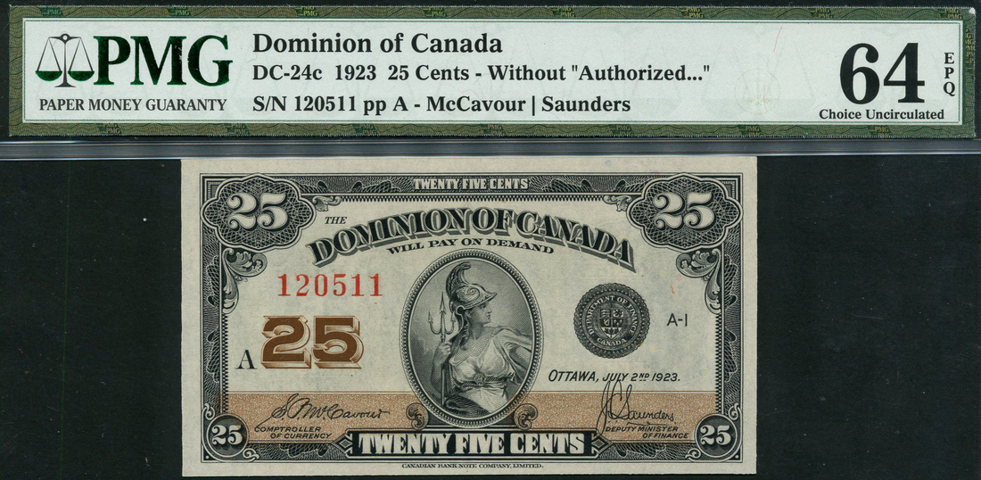 Dominion of Canada, 25 cents, 1900, Boville signature, 25 cents (2), 1923, McCavour-Saunders signatures, all are black and pale brown, Britannia seated at centre