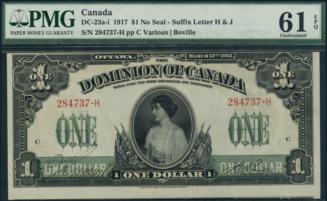 Dominion of Canada, $1, 17 March 1917, serial number 284737-H, black on pale green underprint, portrait Princess Patricia Ramsey at centre, value at left and right, low centre and in each corner, reverse, green, Parliament Building at centre