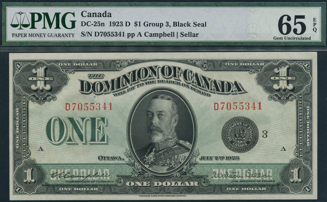 Dominion of Canada, $1, 2 July 1923, serial number D7055341, black on light green underprint, portrait King George V in circular frame at centre, bank title top centre, value at centre left and in border around, Campbell/Sellar signature, black seal, reverse, Library of Parliament at centre