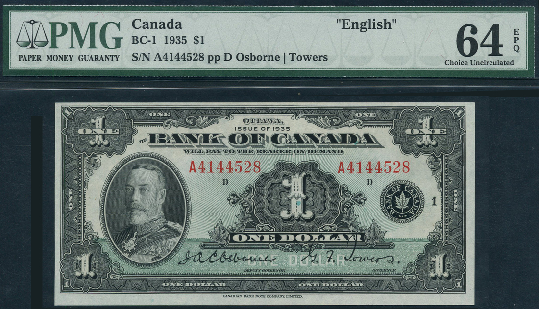 Bank of Canada, $1, ND (1935), serial number A4144528, black on light green underprint, portrait King George V in circular frame at left, bank title top centre, value in each corner and at centre, ornate border, English language, reverse, allegorical maiden at centre