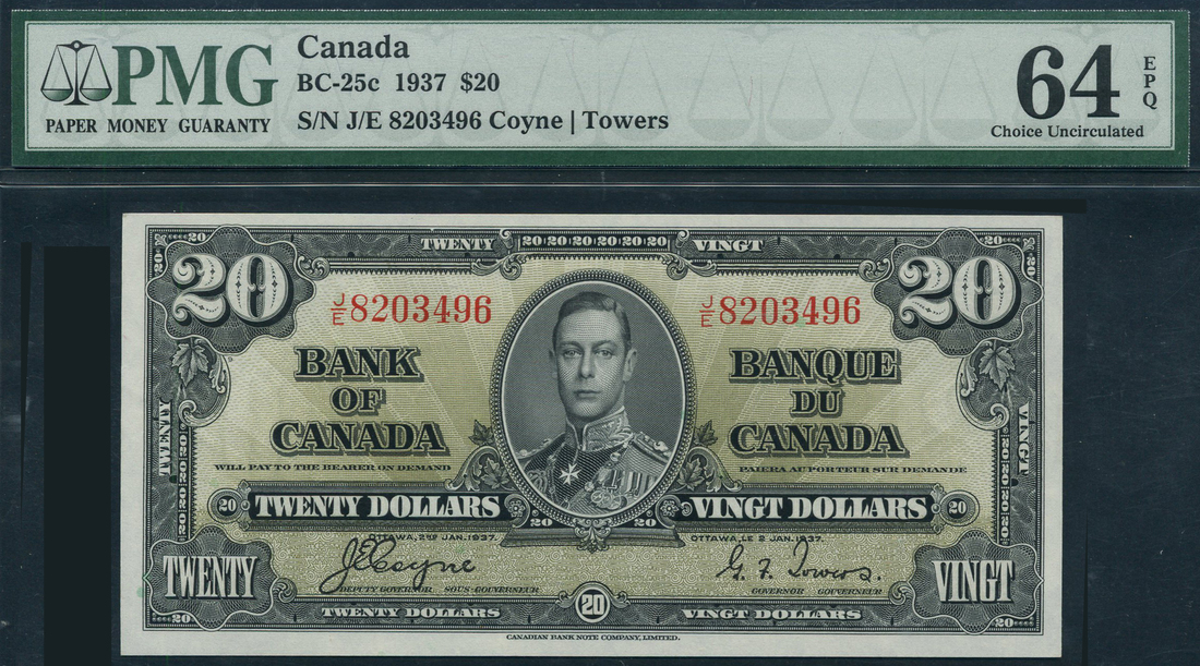 Bank of Canada, $1, $10 and $20, all 2 January 1937, serial numbers A/A9189757, B/T0236668, J/E8203496, black on light green, black on pale pink and black on olive green respectively, all feature portrait King George VI at centre flanked by bank title in English and French, first, Osborne/Towers signature, remainder, Coyne/Towers signature