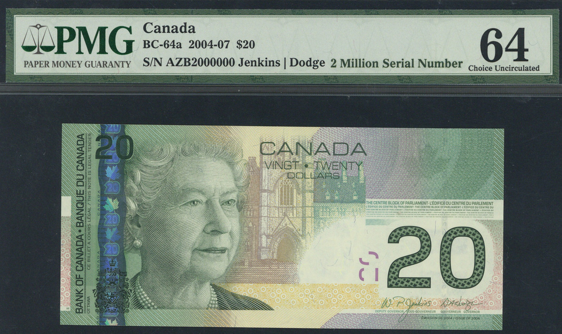 Bank of Canada, $20, ND (2004-7), serial number AZB2000000, green on multicolour underprint, portrait Queen Elizabeth II at left, Parliament in Ottawa in background, reverse, artworks by Bill Reid